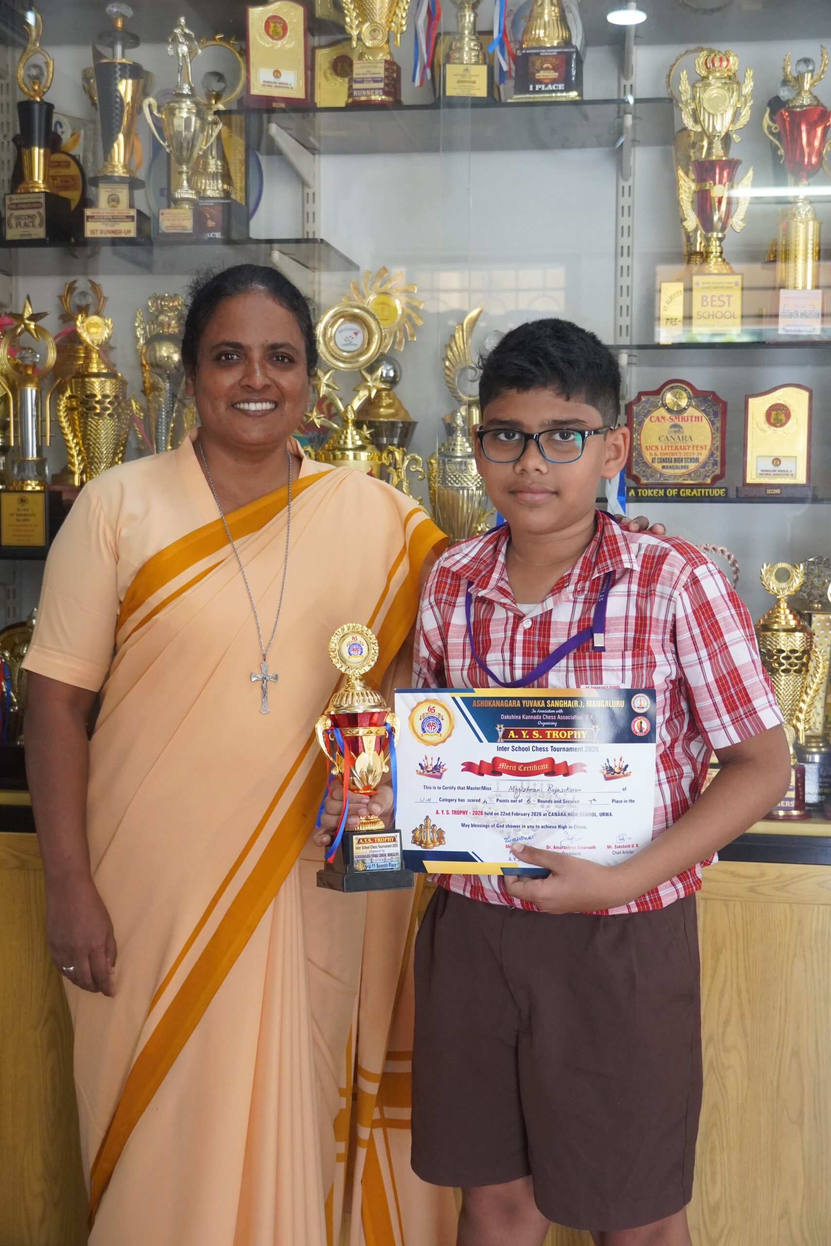 Congratulations to Magizhnan Rajasekaran of Class V‑B! He participated in the 28th RCC International FIDE‑rated Rapid Chess Tournament held at SDM College, where he secured third place