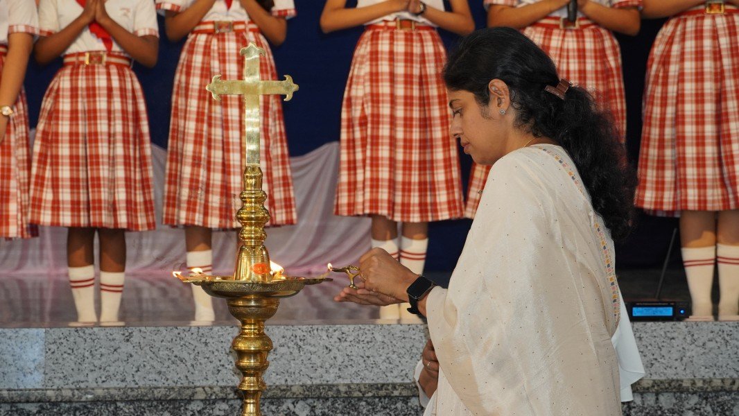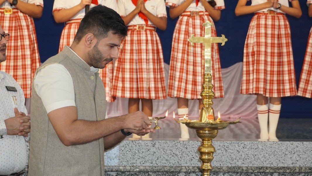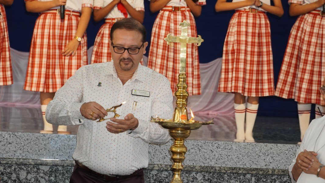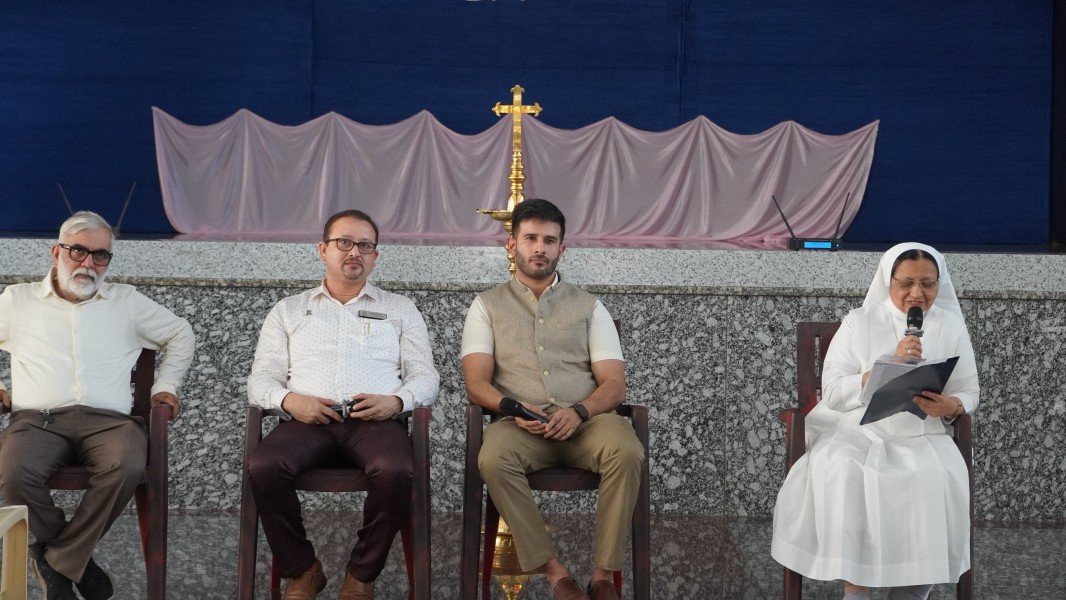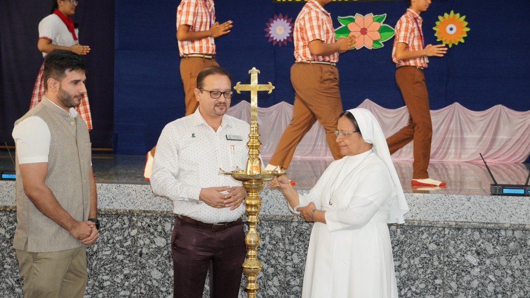The event commenced with a solemn Invocation and the ceremonial Lighting of the Sacred Lamp. The Correspondent, Sr. Shaila, the Principal, Sr. Lourdes, along with the distinguished speakers—Dr. R. G. D’Souza, Mr. Abhimanyu Tomar, and Mrs. Collette Cabral, PTA Vice-President—graced the occasion by jointly lighting the lamp. This symbolic act was followed by a melodious Prayer Song presented by the school choir, which imbued the gathering with a serene and reflective spirit.