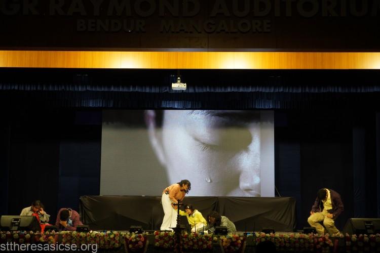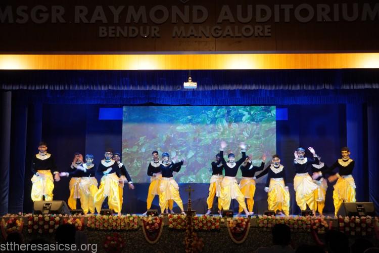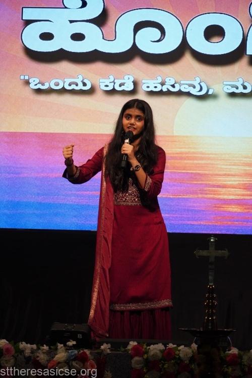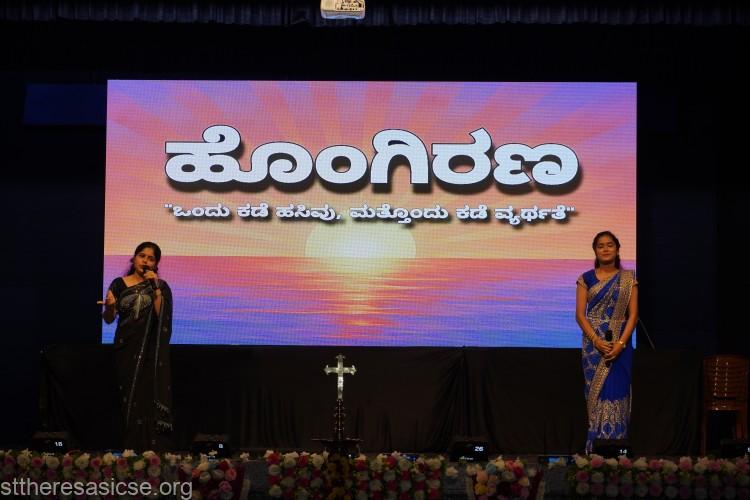 The cultural programme unfolded with a series of captivating performances. The students presented a thought-provoking Kannada drama, “Hongirana,” highlighting the importance of avoiding food wastage. Through their act, they reminded everyone to respect the hard work of farmers and to value every grain of rice. The play also reflected the school’s deep commitment to social service—an integral part of Theresian education—through which students learn to spread kindness and awareness, fulfilling the dreams of St. Thérèse and RFC Mascarenhas.
