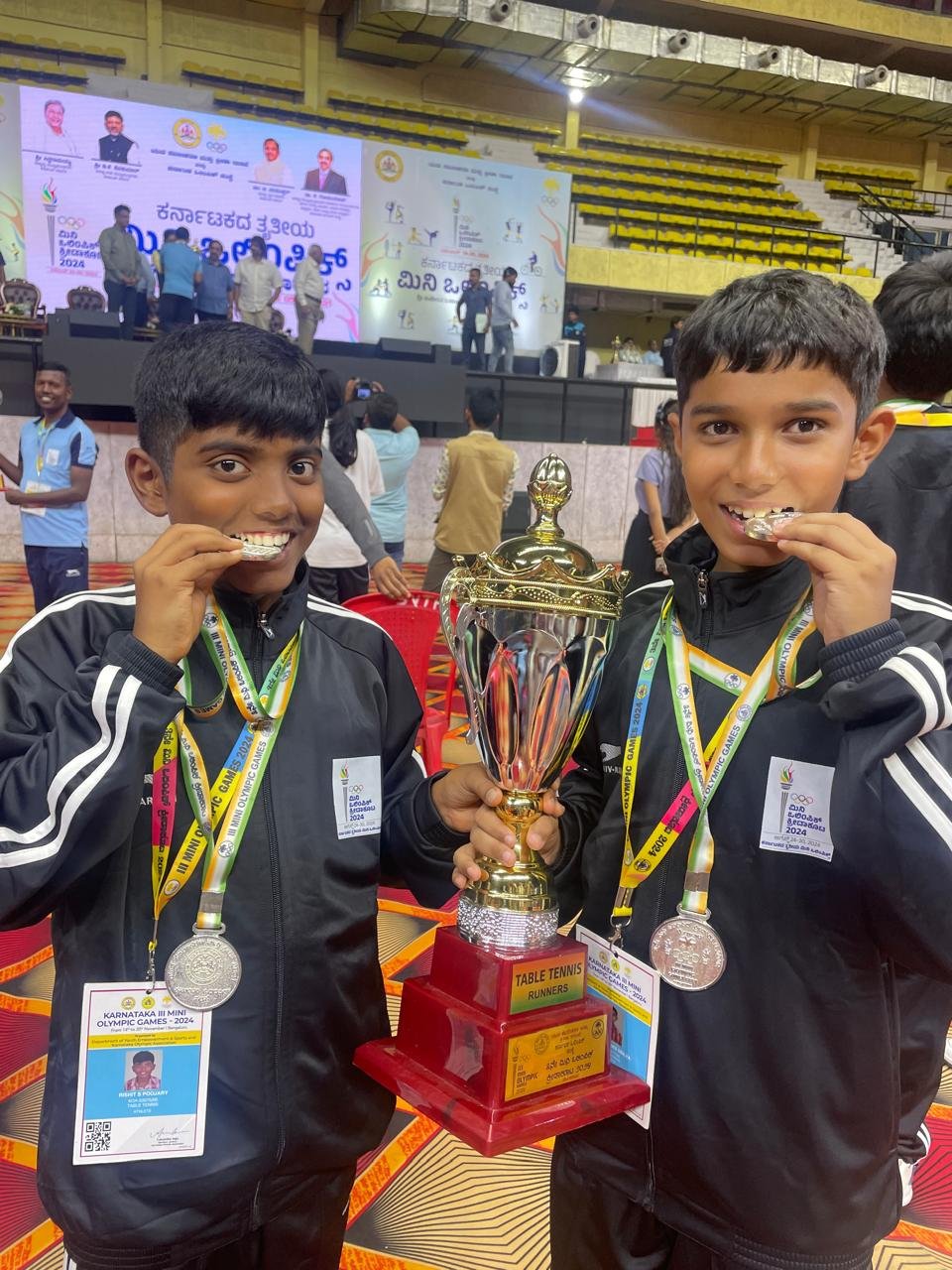 Cahill Moses DSilva and Rishit S Poojary, proud students of Class VII from St. Theresa’s School, Bendur, brought laurels to their alma mater by securing the second place in Table Tennis at the Mini Olympic Games 2024. The prestigious event was held at the Sree Kanteerava Indoor Stadium, Bengaluru, under the aegis of the Karnataka Olympic Association.